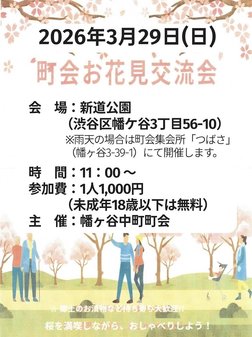 代々木交通安全のつどい in 笹塚開催日 03/28〜03/28開催日 03/28〜03/28イベントお祭り・フェス笹塚ファミリー向け子供向け無料 フレイル予防&終活ノートについての講座開催日 03/25〜03/25開催日 03/25〜03/25イベントセミナー・講習フレイル予防初台シニア向け無料 第2回 笹塚上町会 フリーマーケット 2026開催日 03/28〜03/28開催日 03/28〜03/28イベントマルシェ・フリマ笹塚シニア向けファミリー向け中高生向け子供向け有料無料 水よう日は あきち開放だ あきちディグディグ みんなの広場開催日 03/04〜04/08開催日 03/04〜04/08イベント遊び場幡ヶ谷ファミリー向け中高生向け子供向け無料 本町二丁目町会 さくら祭り 2026開催日 03/28〜03/28開催日 03/28〜03/28イベントお祭り・フェス桜イベント初台シニア向けファミリー向け中高生向け子供向け有料無料 イベント、応募、メンバー募集など 幡ヶ谷中町町会 町会お花見交流会開催日 03/29〜03/29開催日 03/29〜03/29イベント桜イベント幡ヶ谷ファミリー向け子供向け有料 TOKYO outside Festival 新宿中央公園 2026.3開催日 03/28〜03/29開催日 03/28〜03/29イベントお祭り・フェススポーツ渋谷区外ファミリー向け中高生向け子供向け無料 第2回 笹塚上町会 フリーマーケット 2026開催日 03/28〜03/28開催日 03/28〜03/28イベントマルシェ・フリマ笹塚シニア向けファミリー向け中高生向け子供向け有料無料 こども夢の商店街 @東京オペラシティ 2026.3月開催日 03/28〜03/29開催日 03/28〜03/29イベントエントリー募集マルシェ・フリマワークショップ初台ファミリー向け中高生向け子供向け有料申込制 Nゲージ大運行会 2026開催日 03/28〜03/29開催日 03/28〜03/29イベント遊び場鑑賞・観戦渋谷区他シニア向けファミリー向け中高生向け子供向け無料 わくわくサロン(初台)「今日こそ一歩を踏み出そう!」開催日 03/27〜03/27開催日 03/27〜03/27〜 03/25 締切イベントセミナー・講習フレイル予防初台シニア向け無料申込制 第34回 しぶやさくらまつり 2026開催日 03/27〜04/05開催日 03/27〜04/05イベント桜イベント渋谷区他シニア向けファミリー向け中高生向け子供向け有料無料 西原町会 餅つき大会 2026開催日 03/29〜03/29開催日 03/29〜03/29イベント幡ヶ谷シニア向けファミリー向け中高生向け有料 LET’S PLAY STREET!!開催日 03/28〜03/28開催日 03/28〜03/28イベントスポーツ渋谷区他ファミリー向け中高生向け子供向け無料 笹塚仲町会 お花見 2026開催日 03/28〜03/28開催日 03/28〜03/28イベント桜イベント笹塚シニア向けファミリー向け有料 せせらぎ さくらコンサート 2026開催日 03/26〜03/26開催日 03/26〜03/26イベント桜イベント鑑賞・観戦幡ヶ谷シニア向けファミリー向け無料 本町二丁目町会 さくら祭り 2026開催日 03/28〜03/28開催日 03/28〜03/28イベントお祭り・フェス桜イベント初台シニア向けファミリー向け中高生向け子供向け有料無料 富ヶ谷オーガニックマルシェ開催日 03/23〜03/23開催日 03/23〜03/23イベントマルシェ・フリマ渋谷区他シニア向けファミリー向け有料無料 笹塚ボウル × 豆庭杯 2026開催日 03/31〜03/31開催日 03/31〜03/31〜 03/18 締切イベントエントリー募集スポーツ笹塚ファミリー向け中高生向け子供向け有料申込制 笹塚にあるやしのき保育園です!他のお知らせその他募集笹塚 新宿中央公園 夜桜ライトアップ 2026開催日 03/20〜04/12開催日 03/20〜04/12イベント桜イベント渋谷区外シニア向けファミリー向け無料もっと読む 幡ヶ谷中町町会 町会お花見交流会開催日 03/29〜03/29開催日 03/29〜03/29イベント桜イベント幡ヶ谷ファミリー向け子供向け有料 TOKYO outside Festival 新宿中央公園 2026.3開催日 03/28〜03/29開催日 03/28〜03/29イベントお祭り・フェススポーツ渋谷区外ファミリー向け中高生向け子供向け無料 第2回 笹塚上町会 フリーマーケット 2026開催日 03/28〜03/28開催日 03/28〜03/28イベントマルシェ・フリマ笹塚シニア向けファミリー向け中高生向け子供向け有料無料 こども夢の商店街 @東京オペラシティ 2026.3月開催日 03/28〜03/29開催日 03/28〜03/29イベントエントリー募集マルシェ・フリマワークショップ初台ファミリー向け中高生向け子供向け有料申込制 Nゲージ大運行会 2026開催日 03/28〜03/29開催日 03/28〜03/29イベント遊び場鑑賞・観戦渋谷区他シニア向けファミリー向け中高生向け子供向け無料 わくわくサロン(初台)「今日こそ一歩を踏み出そう!」開催日 03/27〜03/27開催日 03/27〜03/27〜 03/25 締切イベントセミナー・講習フレイル予防初台シニア向け無料申込制 第34回 しぶやさくらまつり 2026開催日 03/27〜04/05開催日 03/27〜04/05イベント桜イベント渋谷区他シニア向けファミリー向け中高生向け子供向け有料無料 西原町会 餅つき大会 2026開催日 03/29〜03/29開催日 03/29〜03/29イベント幡ヶ谷シニア向けファミリー向け中高生向け有料もっと読む 町かど通信 鶏白湯ラーメン「白鶏舎」&焼手羽専門店「トリノイロ」オープン!ローカルニュース 親子入浴デーなら無料!ササハタハツエリアおすすめ銭湯3選子育て情報 手土産もご褒美も手に入る♪おしゃれグローサリー店誕生! @ハレルツナガル