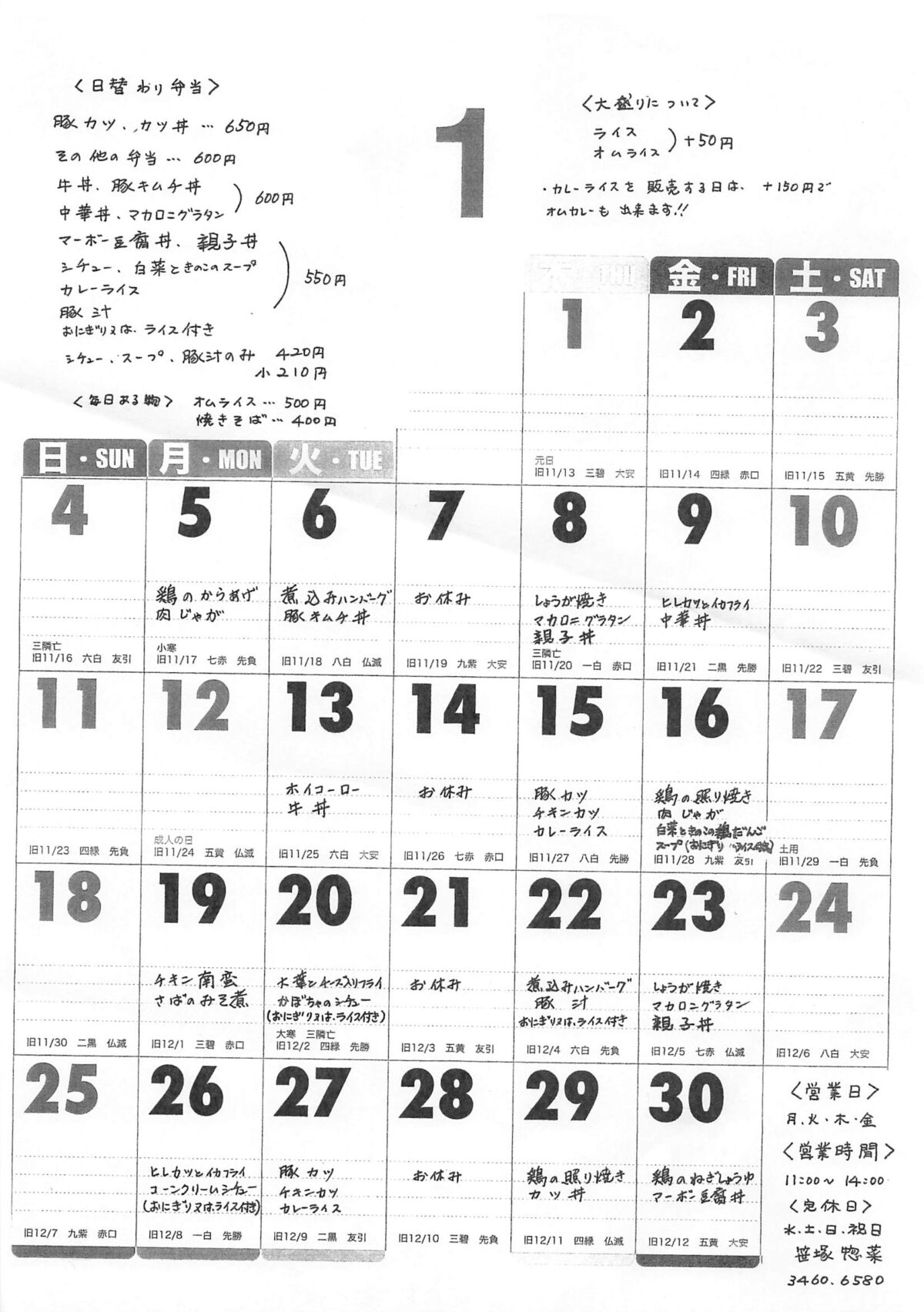笹塚惣菜さん1月のメニュー表