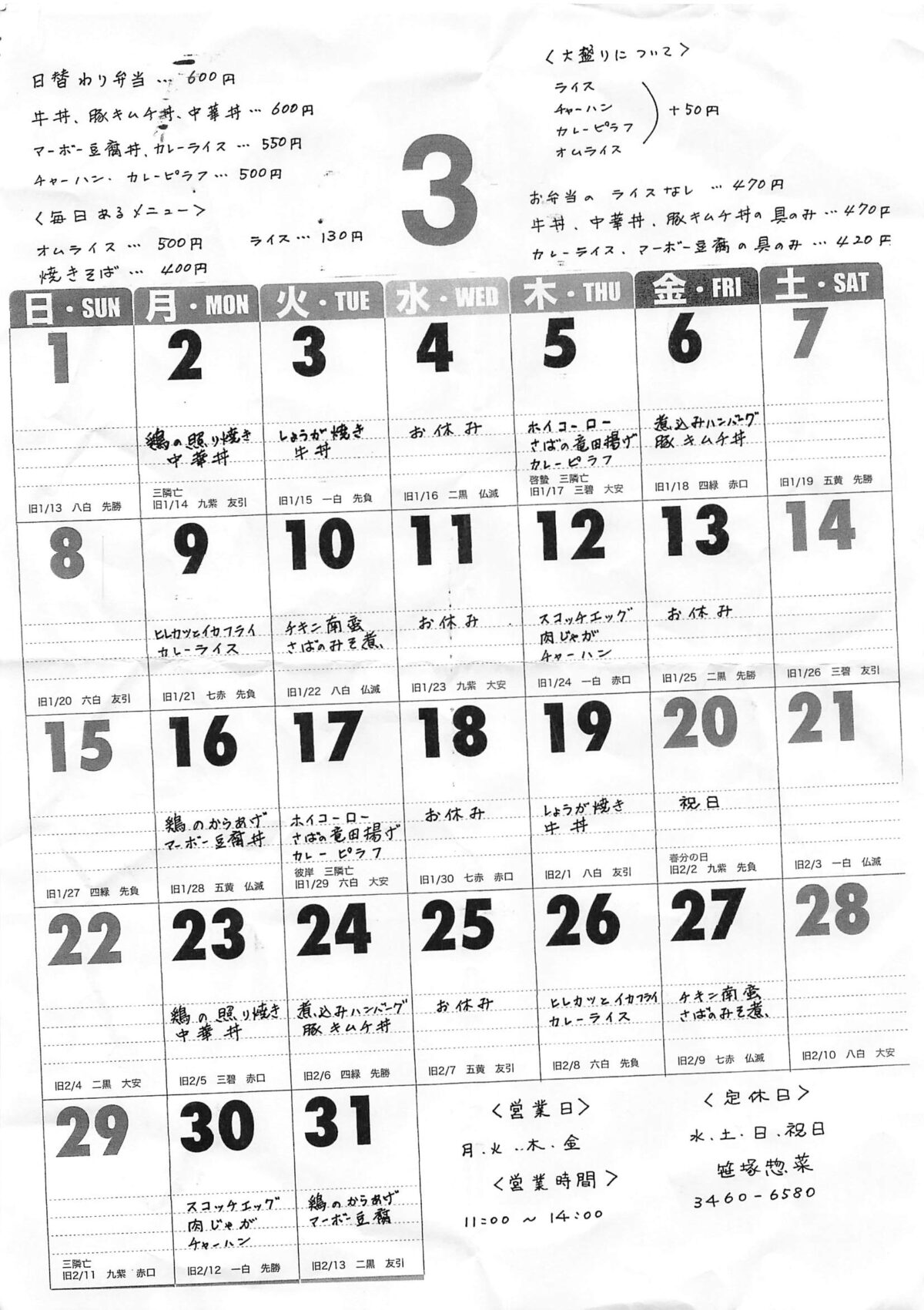 笹塚惣菜さん3月のメニュー表