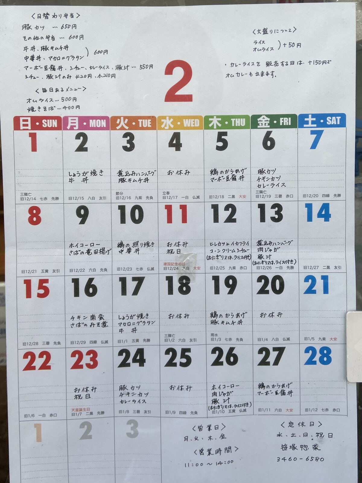 笹塚惣菜さん2月のメニュー表