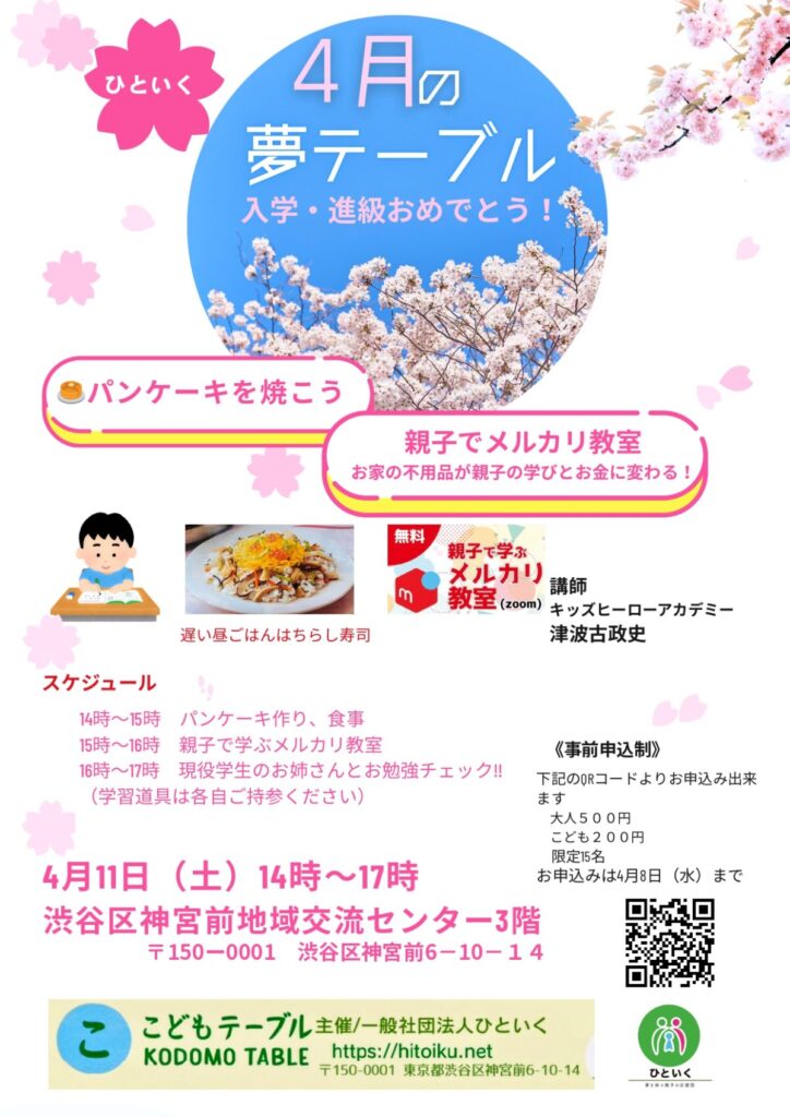 入学・進級のお祝いをテーマに、パンケーキ作りや食事、親子で学べるメルカリ教室、学習サポートなどを行う体験型イベント。親子で楽しく学びながら交流できます。