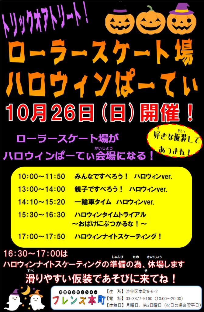 ※16:30~17:00はハロウィンナイトスケーティングの準備の為、休場します