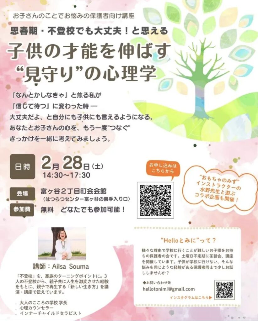 様々な理由で学校に行くことが難しいお子様をお持ちの保護者の会です。土曜日不定期に茶話会、講座を開催しています。子供が学校に行けない、そんな悩みを同じような経験がある保護者同士で少しお話ししませんか?