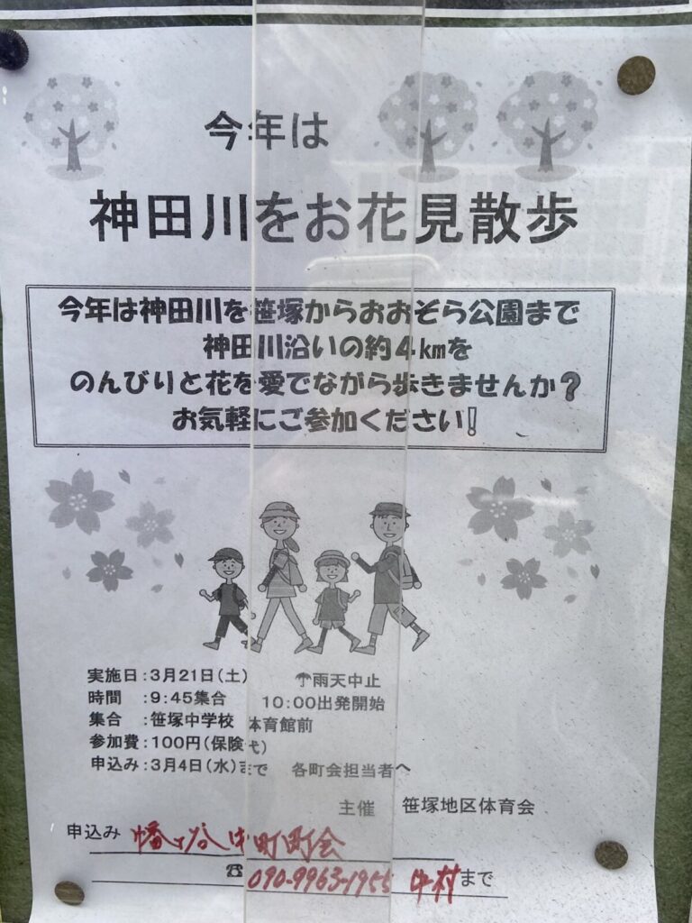 今年は神田川を笹塚からおおぞら公園まで、神田川沿い約4kmをのんびり花を愛でながら歩きませんか?お気軽にご参加ください!