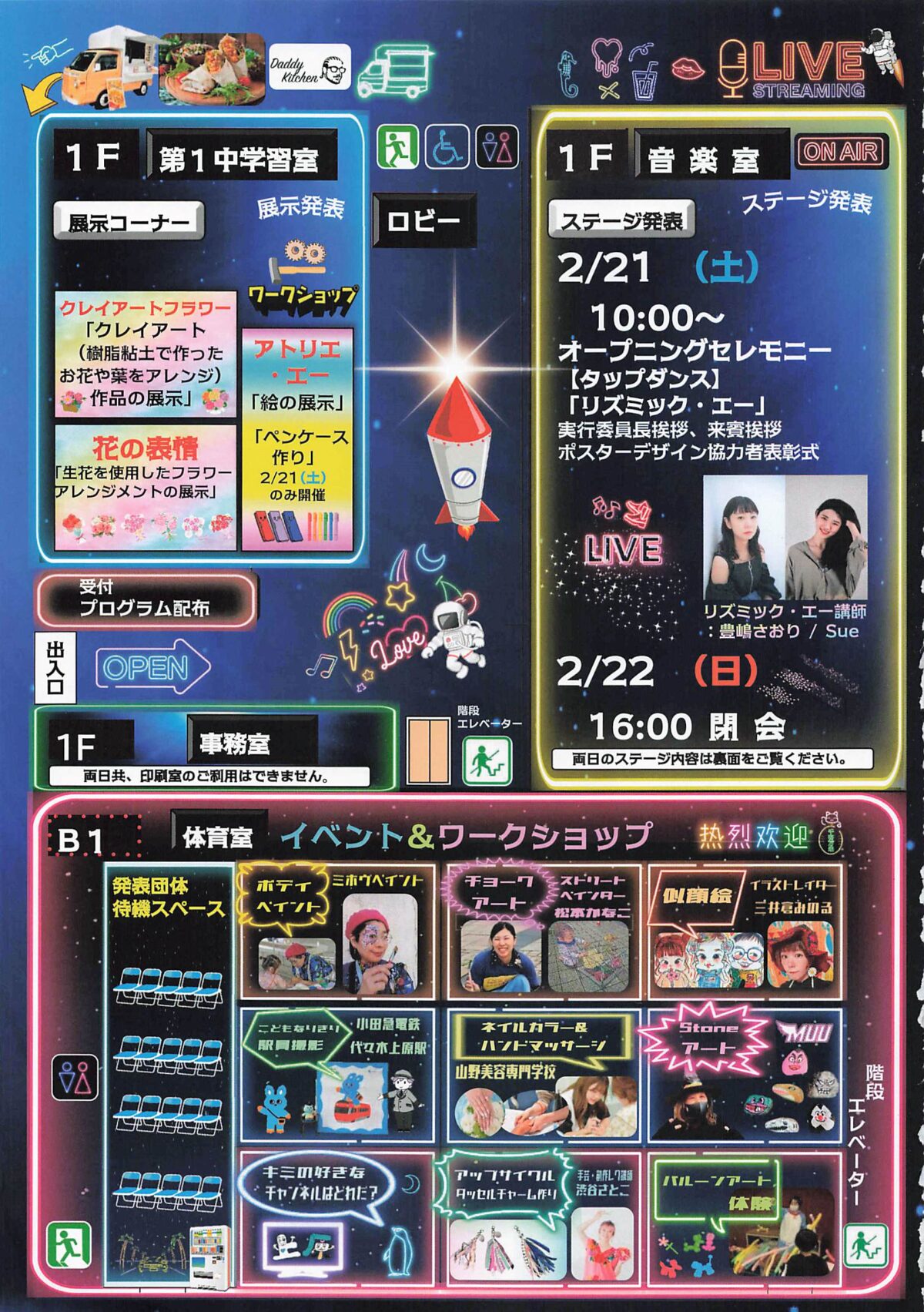恒例の団体発表、作品展示のほか、今回はチョークアート体験、似顔絵、ボディペイント、ストーンアート体験、バルーンアート体験、なりきり駅員撮影、ハギレを再利用したタッセル作りなど、皆様にご参加・体験していただく催しを多数ご用意しております!