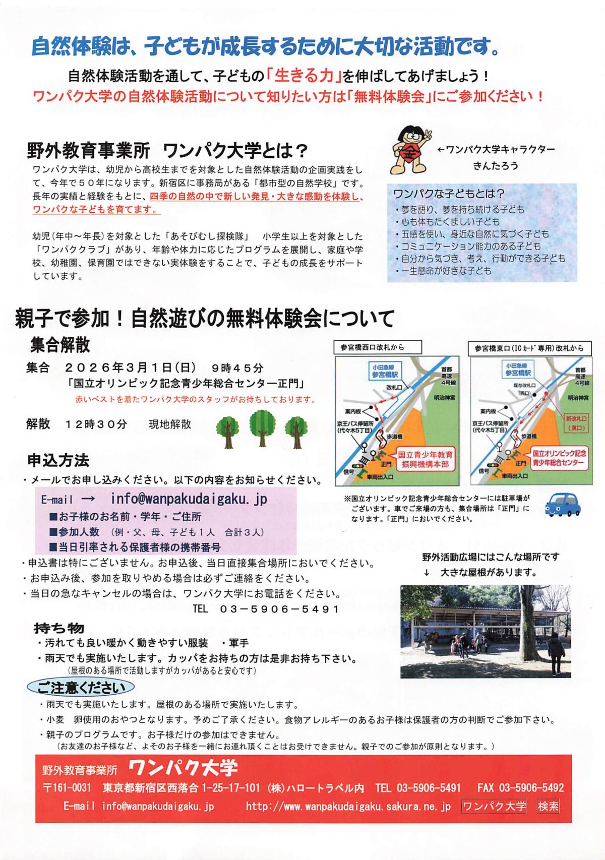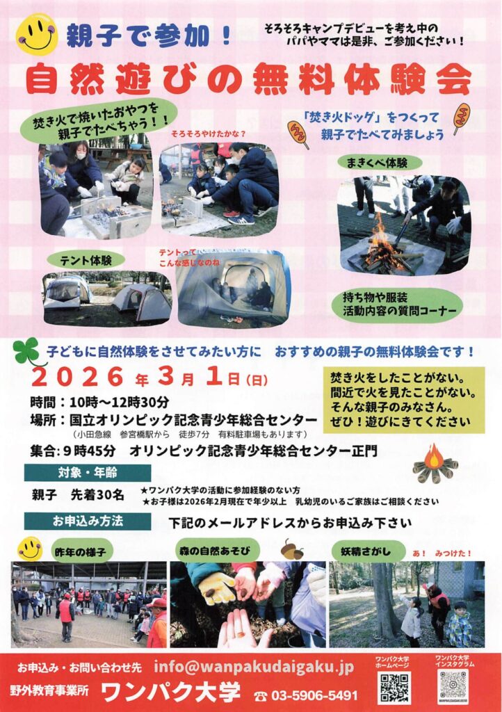・対象:親子(先着30名)/ワンパク大学の活動に参加経験のない方/お子様は2026年2月現在で年少以上(乳幼児のいるご家族は要相談)