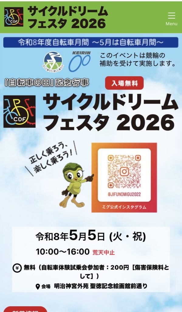 さまざまな自転車を「見て・乗って・体験できる」大型サイクルイベント。ロードバイクや電動アシスト自転車の試乗、子ども向け自転車教室、交通安全講習、BMXショーなど、親子で楽しめるコンテンツが充実しています。